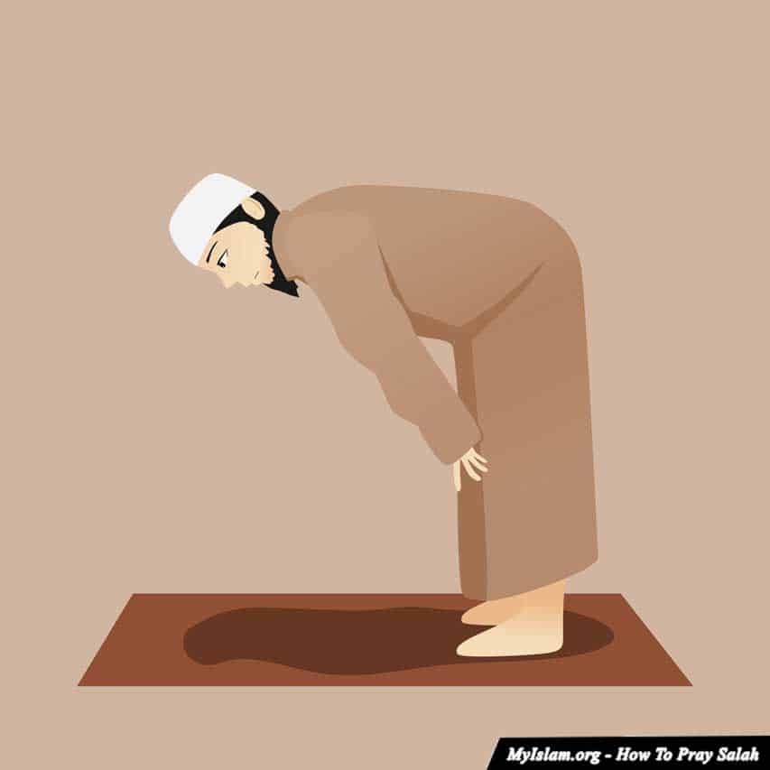As you are bowing down say ‘Allahu Akbar’. Make sure to keep your back straight, your hands on your knees, and your eyes focused on the ground where you will be prostrating.